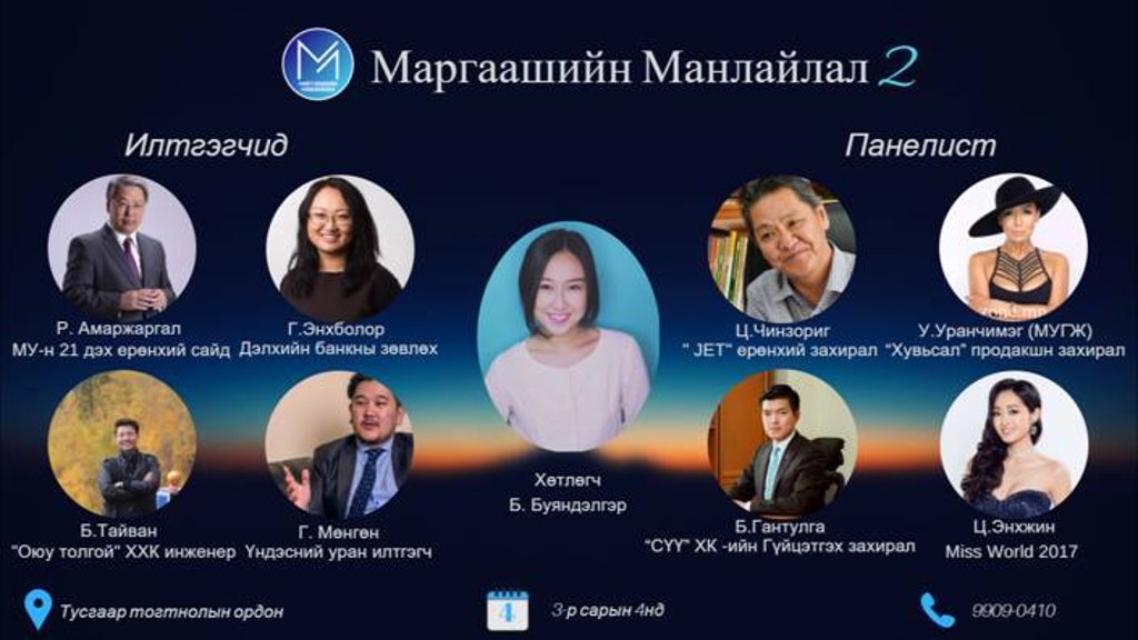 Дэлхийн залуустай хөл нийлүүлэн алхаж буй Монгол улсын төлөөлөл болсон амжилттай яваа илтгэгч нар өөрийн мэдлэг, туршлага, үнэт зөвлөгөөгөө бидэнтэй хуваалцах юм.