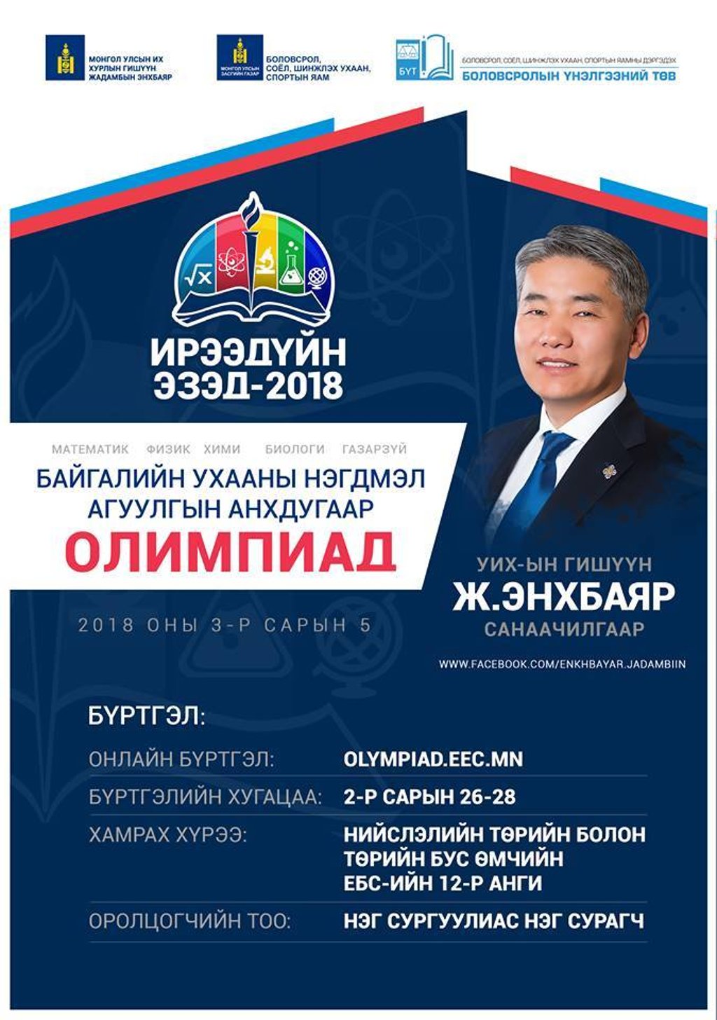 - Олимпиадад оролцогч суралцагчийг 2018 оны 02 дугаар сарын 26-ны өдрийн 09.00 цагаас эхлэн 2018 оны 02 дугаар сарын 28-ны өдрийн 18.00 цаг хүртэл Боловсролын үнэлгээний төвийн www.eec.mn хаягаар тухайн сургуулийн сургалтын менежер өөрөө бүртгэнэ.