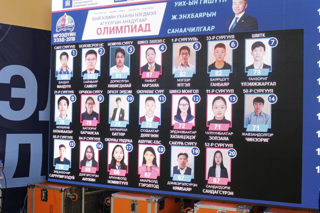 Шалгалт дуусмагц оролцсон 184 хүүхдийн материалыг засагч машинд уншуулж, танхимд байрлуулсан дэлгэц дээр мэдээллээ. Ингэснээр онооны дарааллаар эхний байруудад шалгарсан сурагчид ширээнийхээ ардаас шууд тодорч шагналаа гардсан юм.