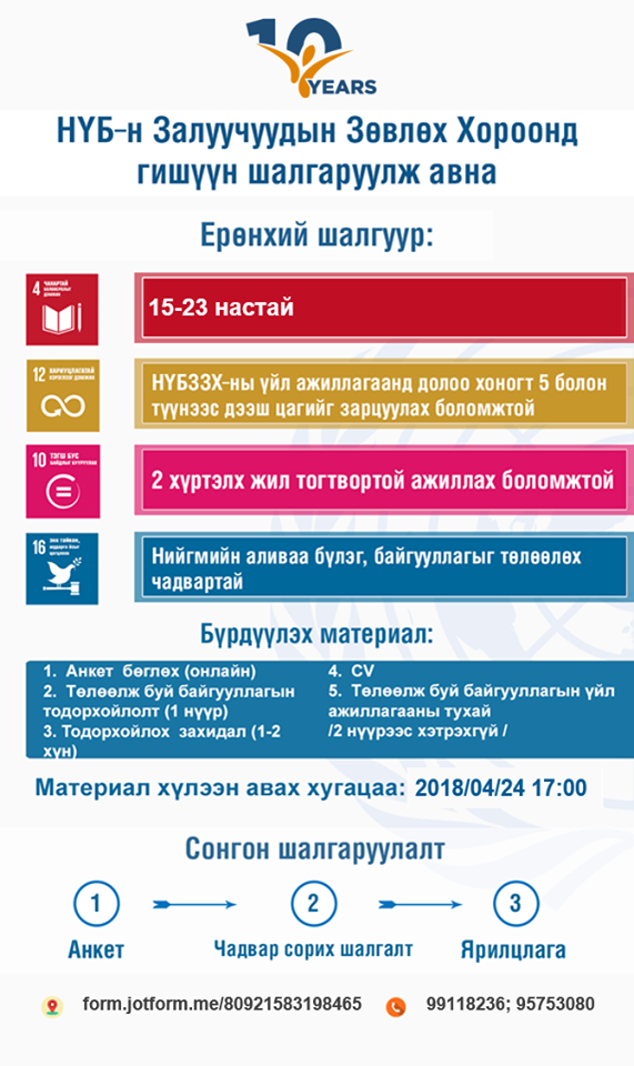 Монгол улсын 15-23 насны иргэн танд НҮБЗЗХ-ны гишүүн болж өөрийн төлөөлж буй байгууллага болон Монголын залуучуудын дуу хоолой төлөөлөл болон ажиллах боломж бий.
