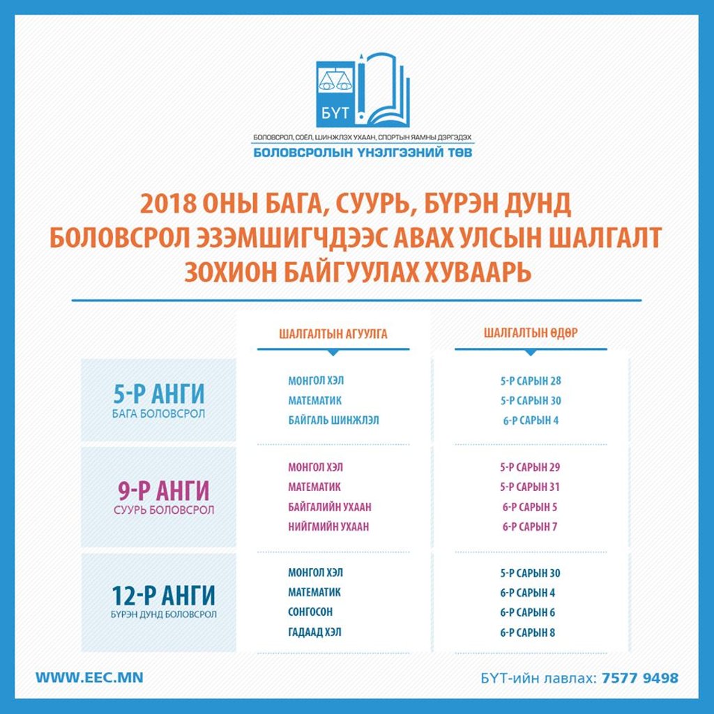 Улсын шалгалтад 2018-2019 оны хичээлийн жилд ерөнхий боловсролын сургуулийн 5, 9, 12-р анги төгсөгчид хамрагдана. Улсын шалгалт орон даяар Улаанбаатар хотын цагаар нэгэн зэрэг зохион байгуулагдана.