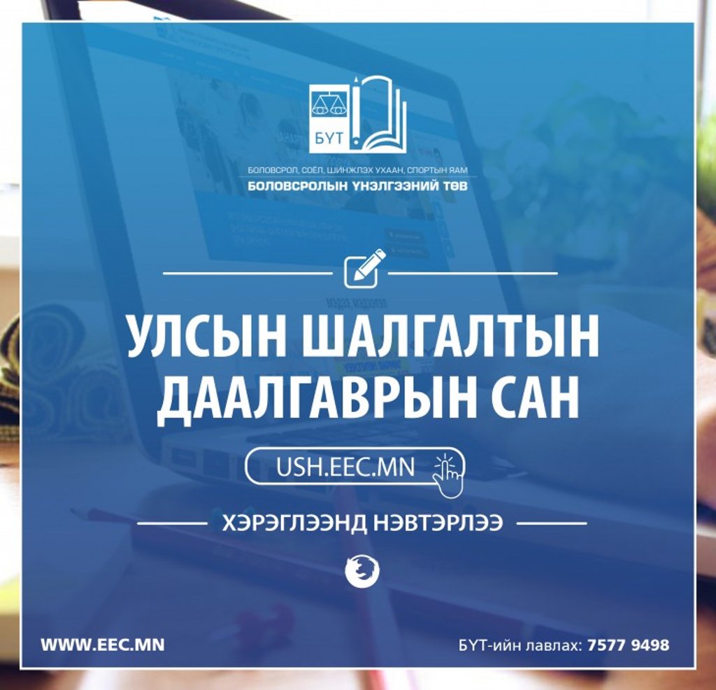 Үндэсний хэмжээнд бага, суурь, бүрэн дунд боловсролын төгсөх ангийн суралцагчдын мэдлэг, чадварын түвшин, боловсролын чанарыг үнэлэх зорилготой Улсын шалгалтын “Даалгаврын сан” хэрэглээнд нэвтэрлээ. Даалгаврын санд нэвтрэх бол www.ush.eec.mn холбоос дээр дарна уу.