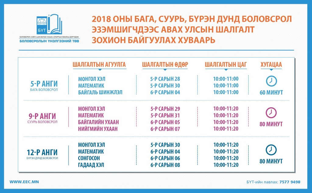 Улсын шалгалтад 2017-2018 оны хичээлийн жилд ерөнхий боловсролын сургуулийн 5, 9, 12-р анги төгсөгчид хамрагдана. Улсын шалгалт орон даяар Улаанбаатар хотын цагаар нэгэн зэрэг зохион байгуулагдана.