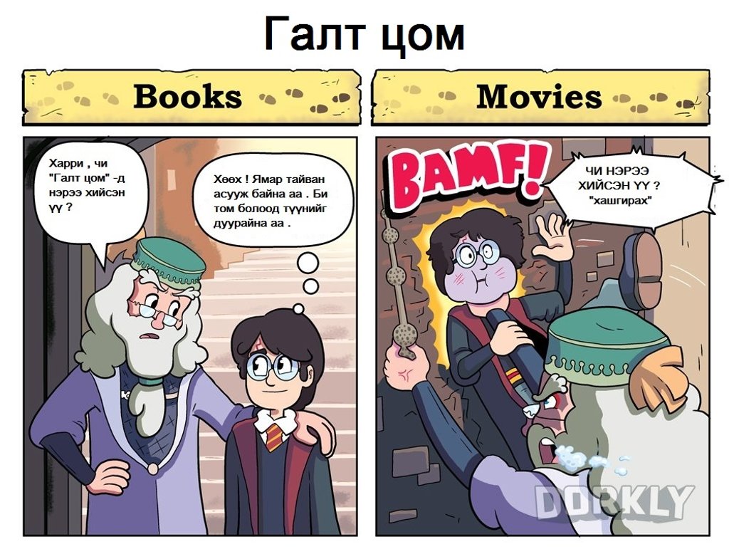 Дэлхий даяар 90 гаруй оронд хэвлэгдэж, бүх насны хүмүүсийн шимтэн уншиж, үзэх болсон “Харри Поттер” цуврал зохиолын ном, кино хоёр зарим талаараа ялгаатай болохыг Поттер-Толгойтон (Харри Поттер зохиолын фенүүд) та бүхэн магадгүй анзаарсан биз ээ. Харин комик зураач Жорж Ротткам ( George Rottkamp), Андрей Бриджман нар хөгжилтэй байдлаар ийнхүү илэрхийлжээ.