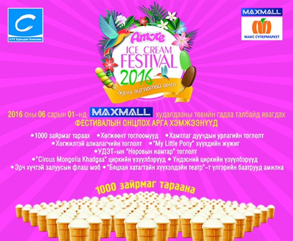 Дэлгэрэнгүй: Монгол улсын ууган үйлдвэр “Сүү” ХК-иас хүүхэд багачууддаа зориулан “Аморе фестивал”-ыг жил бүр зохион байгуулдаг бөгөөд энэ жилийн онцлох арга хэмжээнүүд нь: 1000 зайрмаг үнэгүй тараана, Хамтлаг дуучдын урлагийн тоглолт, хөгжөөнт тоглоомууд, хөгжилтэй алиалагчийн тоглолт, “My Little Pony” хүүхдийн жүжиг, УДЭТ-ын “Норовын намтар” тоглолт, “Circus Mongolia Khadgaa” циркийн үзүүлбэрүүд, Үндэсний циркийн үзүүлбэрүүд, эрч хүчтэй залуусын флаш моб, “Бяцхан хатагтайн хүүхэлдэйн театр”-т үлгэрийн баатрууд амилна.