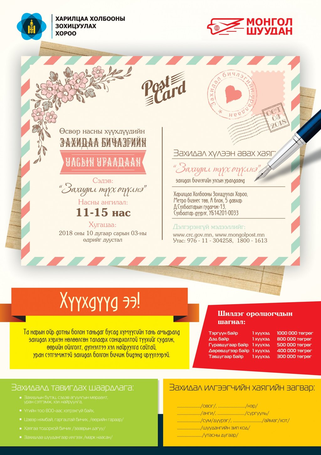 Харилцаа холбооны зохицуулах хороо, Монгол шуудан ХК хамтран “Дэлхийн шуудангийн өдөр”-ийг угтан “Захидал түүх өгүүлнэ” сэдэвт захидлын уралдааныг 11-15 нас буюу өсвөр насны хүүхдүүдийн дунд зарлаж байна.