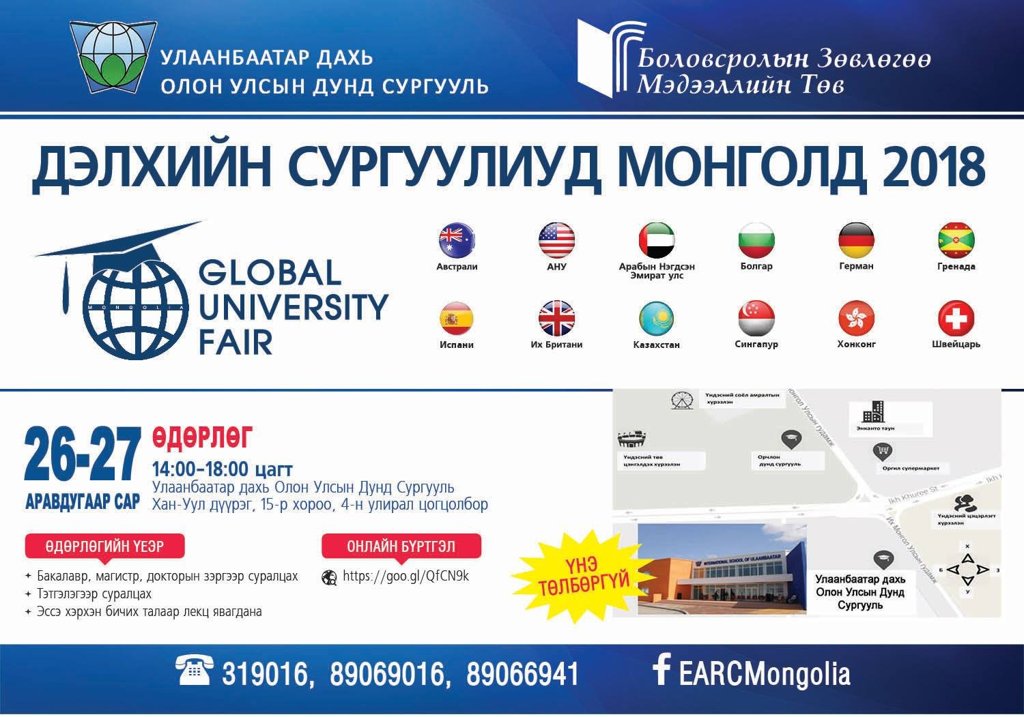 Боловсролын Зөвлөгөө Мэдээллийн Төв ТББ (#EARC), Улаанбаатар дахь Олон Улсын Дунд Сургууль (#ISU) хамтран гурав дах жилдээ "Global University Fair 2018" буюу “Дэлхийн сургуулиуд Монголд 2018” боловсролын өдөрлөгийг 2018 оны 10-р сарын 26-27-ны өдрүүдэд зохион байгуулах гэж байна.