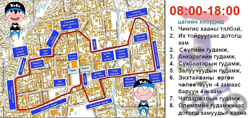 Энэ өдөр дараах зурагт харагдах улаанаар тэмдэглэсэн замуудыг 08:00-18:00 цагийн хооронд хаах бөгөөд дугуй, пэнни, скэйт, ролликоо тэгшхэн, энхэл донхолгүй урт замд унах гайхалтай боломж олдож байна гэсэн үг.