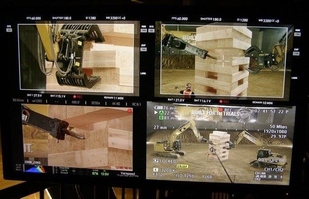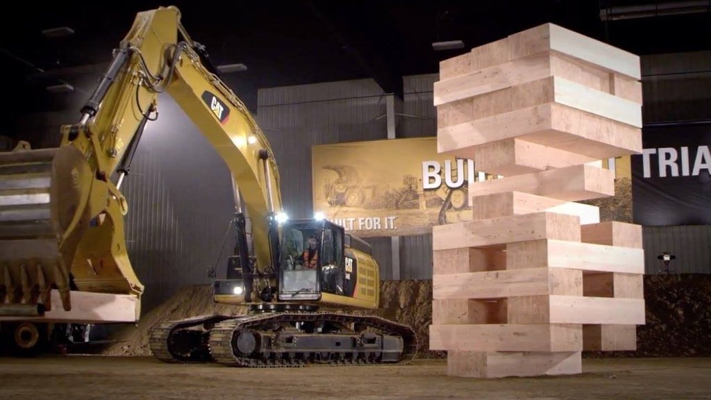 Тус тоглоомыг Caterpillar буюу Cat үйлдвэрийн сэрээт өргөгч олон төрлийн ачигч, хавчдаг өргөгч, экскаватор машинуудыг ашиглан тоглосон юм. Ингэхдээ нэг бүр нь 40 см өндөр 272 кг жинтэй 27 ширхэг нарс модон блок ашиглажээ. АНУ-ын Иллинойс мужийн Эдуардс дахь Caterpillar-ийн туршилтын байгууламжид 28 цагийн турш тоглохдоо 13 давхар өрж, 16 блокийг шилжүүлжээ.