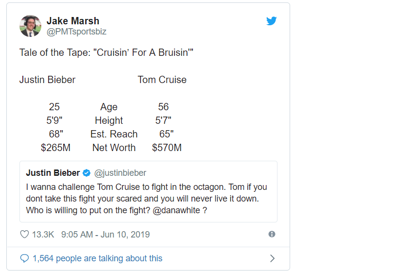 Үүний зэрэгцээ спортын хошин подкаст хөтлөгч Жек Марш тэр хоёрыг харьцуулан бичиж олны анхаарлыг татжээ. Тэд насны зөрүү, олсон ашиг орлогын зөрүү гэх мэтчилэн зүйлсийг харьцуулсан байна. Том өдгөө 56 настай олон адал явдалт кинонд дүр бүтээж, бидний хамгийн сайн мэдэх “Биелэгдэшгүй даалгавар” хэмээх киноны гол дүрээр сэтгэлд хоногшсон билээ. Түүний ашиг орлого Биберийнхээс хэд дахин илүү ажээ.