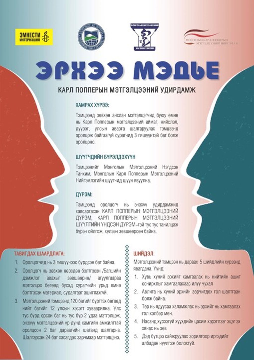 Энэхүү тэмцээнд зөвхөн анхлан мэтгэлцэгчид буюу өмнө нь Карл Попперын мэтгэлцээний аймаг, нийслэл, дүүрэг, улсын аварга шалгаруулах тэмцээнд оролцож байгаагүй сурагчид багаараа оролцох боломжтой юм. Хэрвээ өмнө нь эдгээр тэмцээнд орж байсан туршлагатай бол хойч үедээ боломж олгоорой.