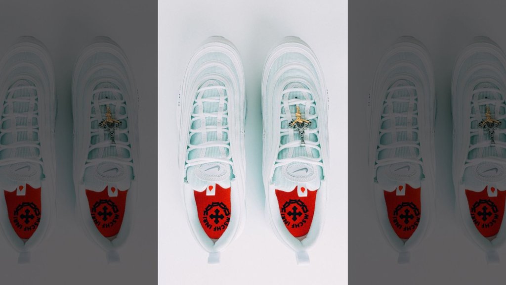 Библийн Матайн 14:25 номлол дээр Есүс усан дээр алхаж байгаа болон түүнээс цус дусалж байгаа талаар дурддаг. Тэгвэл "MSCHF" лабелийн хамт олон үүнээс санаа аван "Jesus Shoes" хэмээх хачирхалтай нэртэй бүтээлээ урлажээ. Анхилам үнэртэй улавч, үдээснээс нь унжих цовдлуулсан Есүсийн тэмдэг, Поп лам нарын өмсдөг улаан гутлыг илэрхийлсэн улавч зэрэг гайхалтай нарийн чимэглэлүүдтэй. Мөн хайрцган дээрээ сахиусан тэнгэр, Католик шашны санваартнуудын ашигладаг албан ёсны тамга зэргийг дүрсэлсэн байдаг.