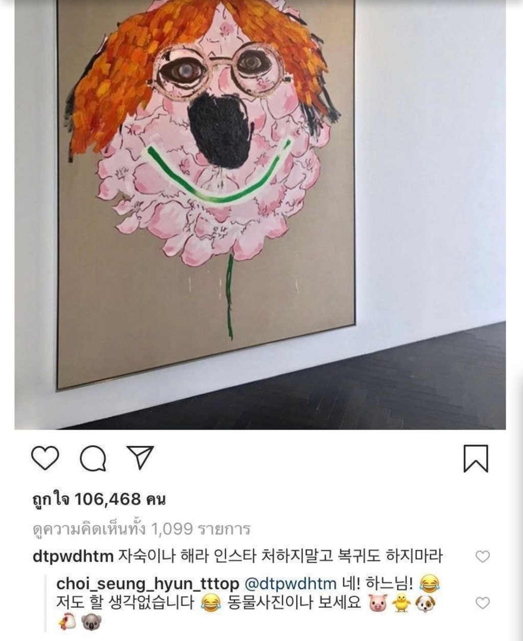 Харин T.O.P, "НАДАД УРЛАГИЙН ЕРТӨНЦӨД ДАХИН ХӨЛ ТАВИХ БОДОЛ АЛГА. ЗҮГЭЭР Л ЗУРАГ ҮЗЭЖ БАЙНА" гэж хариулжээ. Ингээд хэсэг хугацааны дараа сэтгэгдлээ устгасан байна.