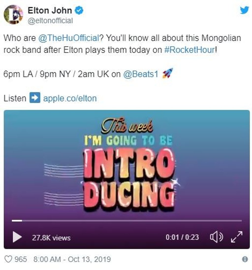 Алдарт дуучин Элтон Жон өөрийн хөтлөн явуулдаг "Rocket hour" хөгжмийн хөтөлбөрөөрөө "The Hu" хамтлагийг онцгойлон танилцуулжээ. Энэ талаар өчигдөр твиттер хуудаснаа жиргэсэн байна.
