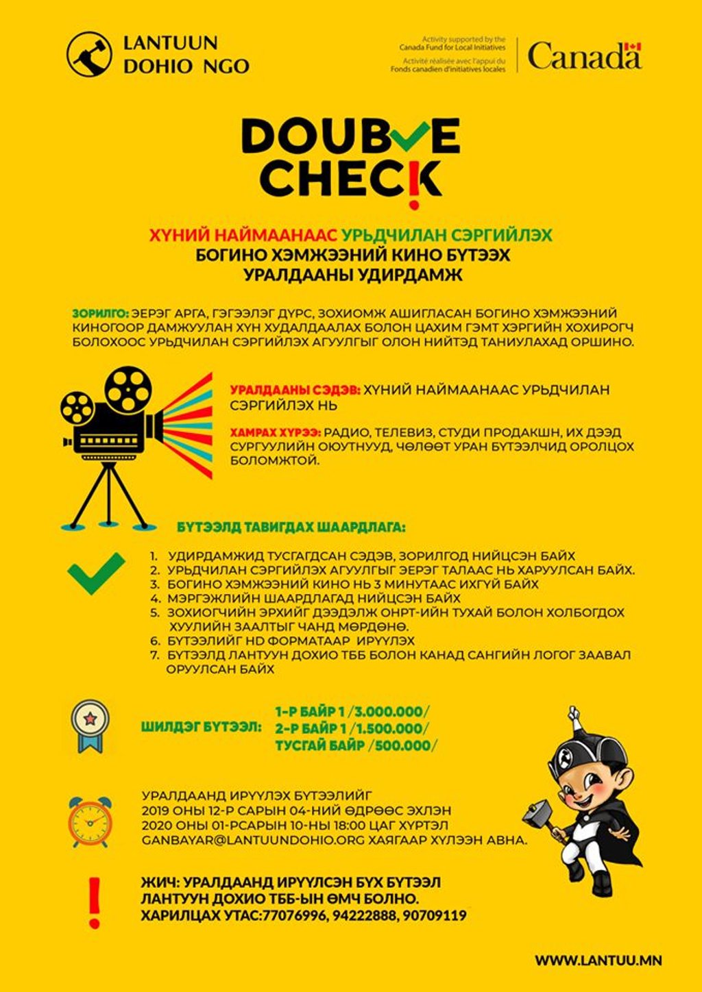 Дэлгэрэнгүй: Лантуун дохио ТББ-ын санаачлагаар хүний наймаанаас урьдчилан сэргийлэх "Double check" нөлөөллийн ажлыг албан ёсоор эхлүүлсэн юм. Тус компанит ажлын эхлэл болгон "Хүний наймаанаас урьдчилан сэргийлэх" богино хэмжээний кино бүтээх уралдааныг Канадын элчин сайдын яамны дэмжлэгтэйгээр зохион байгуулж, уран бүтээлчдийн авьяас, ур ухаан шингэсэн бүтээлээр дамжуулан нийгэмд эерэг нөлөөлөл үзүүлэхээр зорьж байна. Сурагчид, оюутнууд та бүхэн амралтаараа баг хамт олноороо нийлж богино хэмжээний кино хийж болох юм.