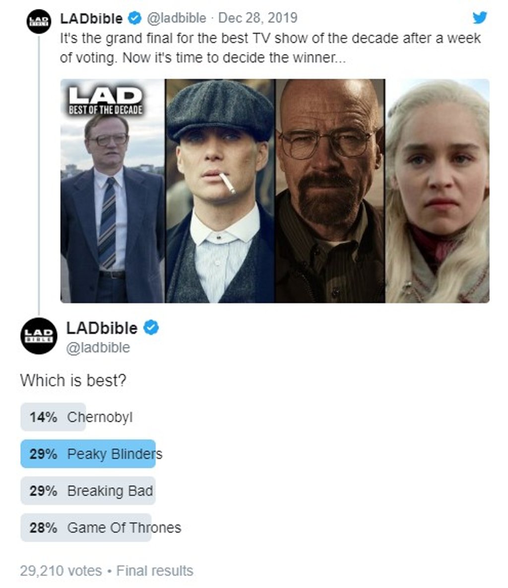 Тус санал асуулгад “Stranger Things”, “Breaking Bad”, “Game Of Thrones”, “Sky”, “Black Mirror” зэрэг олон алдартай бүтээлүүд өрсөлдсөн билээ. Ийнхүү финалын шатанд 29'000 гаруй хүн санал өгч, “Breaking Bad”, “Game Of Thrones”, “Chernobyl”, “Peaky Blinders” цувралууд энэ тэнцүүхэн өрсөлдөж байсан бөгөөд эцсийн мөчид BBC сувгийн албан ёсны цуврал болох "Peaky Blinders” 29.4% хувийн саналаар тэргүүлжээ.
