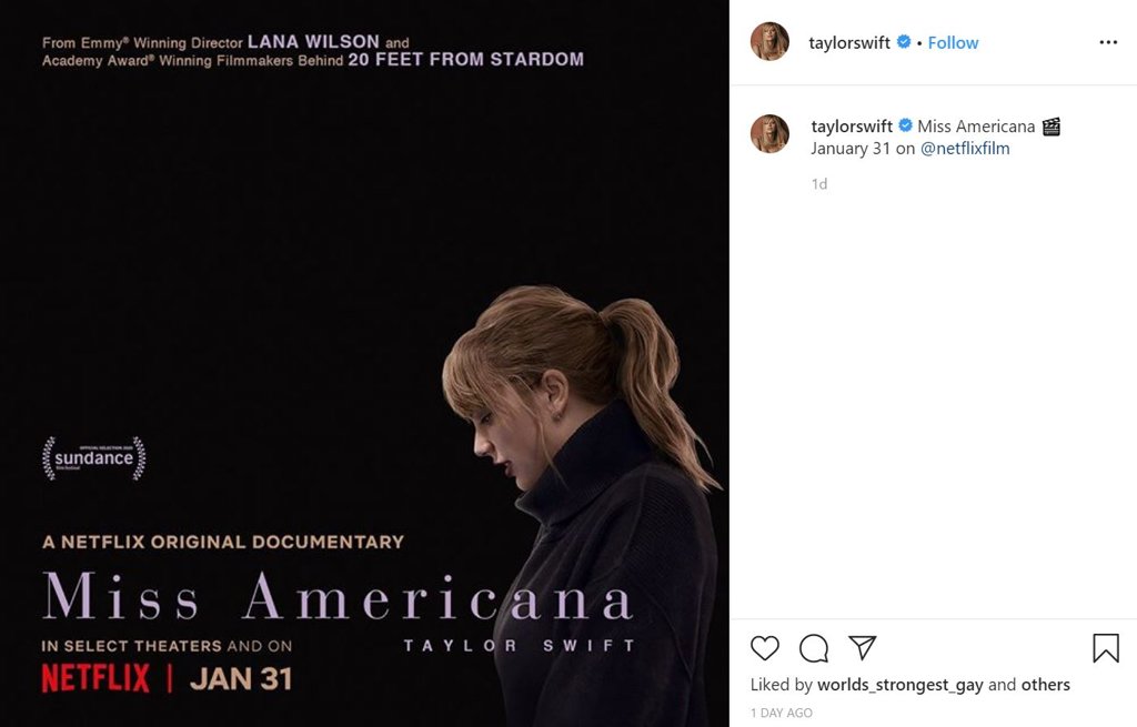 Дуучин Taylor Swift өнгөрсөн оны арваннэгдүгээр сард өөрийнх нь амьдралын тухай өгүүлэх "Miss Americana" хэмээх баримтат кино хийгдэж буй талаар мэдэгдэж байсан. Тэгвэл өчигдөр буюу нэгдүгээр сарын 16-нд уг баримтат кино энэ сарын 31-ний өдөр Netflix сүлжээнд тавих гэж байгааг албан ёсоор мэдэгдлээ. Тэрээр 125.6 сая гаруй дагагч бүхий Инстаграм хуудсандаа дараах мэдээллийг нийтэлсэн юм.