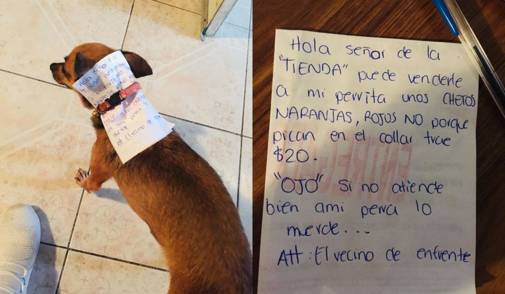 Ингээд “Сайн байна уу худалдагч аа. Манай нохойд улбар шар өнгийн Читос чипснээс өгч явуулаарай. Улаан нь хэрэггүй шүү. Хэтэрхий халуун ногоотой байдаг юм. Нохойн хүзүүвчинд 20 доллар бий” хэмээн бичээд нохойгоо гудамжны нөгөө талд байрлах дэлгүүр рүү явуулсан байна.