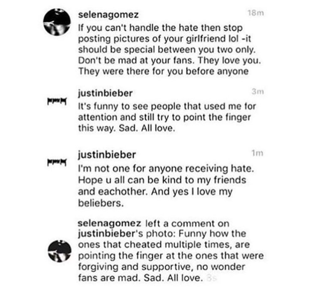 Тэдний зургийн дор шүтэн бишрэгчид (ялангуяа Желенагийн фэнүүд) нь шинэ найз охиныг нь гоочилсон үг хэллэг бичиж байсан нь Жастиныг нэлээн бухимдуулж “Залуус аа, хэрэв элдэв хараал доромжлолоо зогсоохгүй бол би өөрийн инстаграм хаягаа хувийнх (зөвхөн зөвшөөрөгдсөн хүмүүст харагддаг) болголоо шүү. Хэрэв та бүхэн жинхэнэ шүтэн бишрэгчид мөн л бол миний сайн хүнд ингэж хандаж болохгүй юмсан” хэмээн бичжээ.