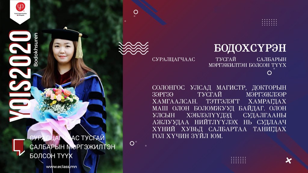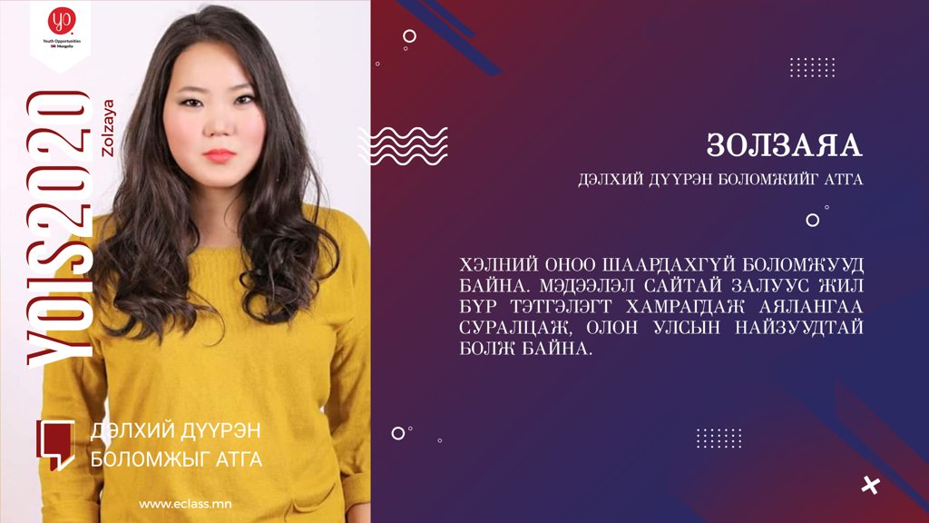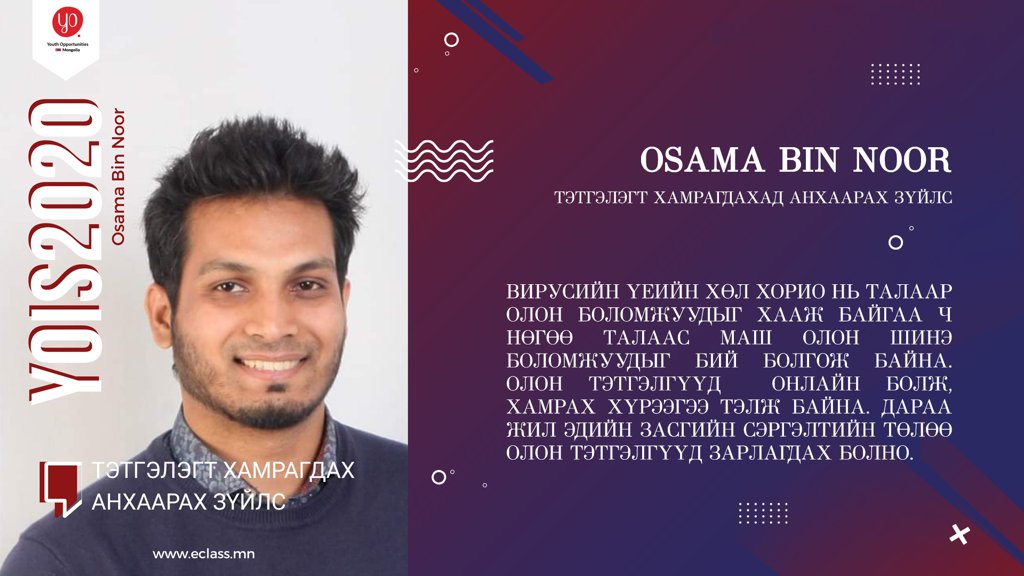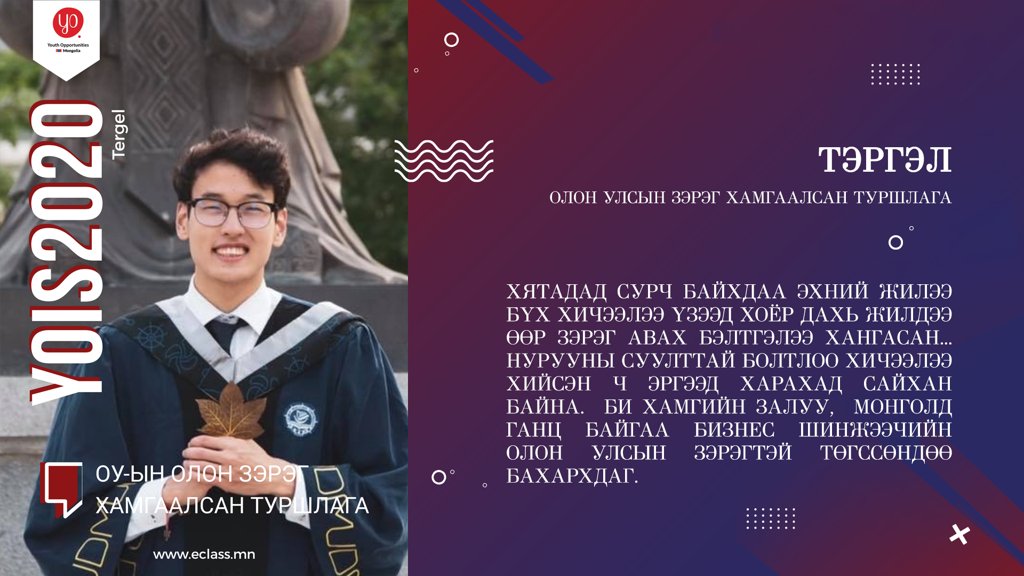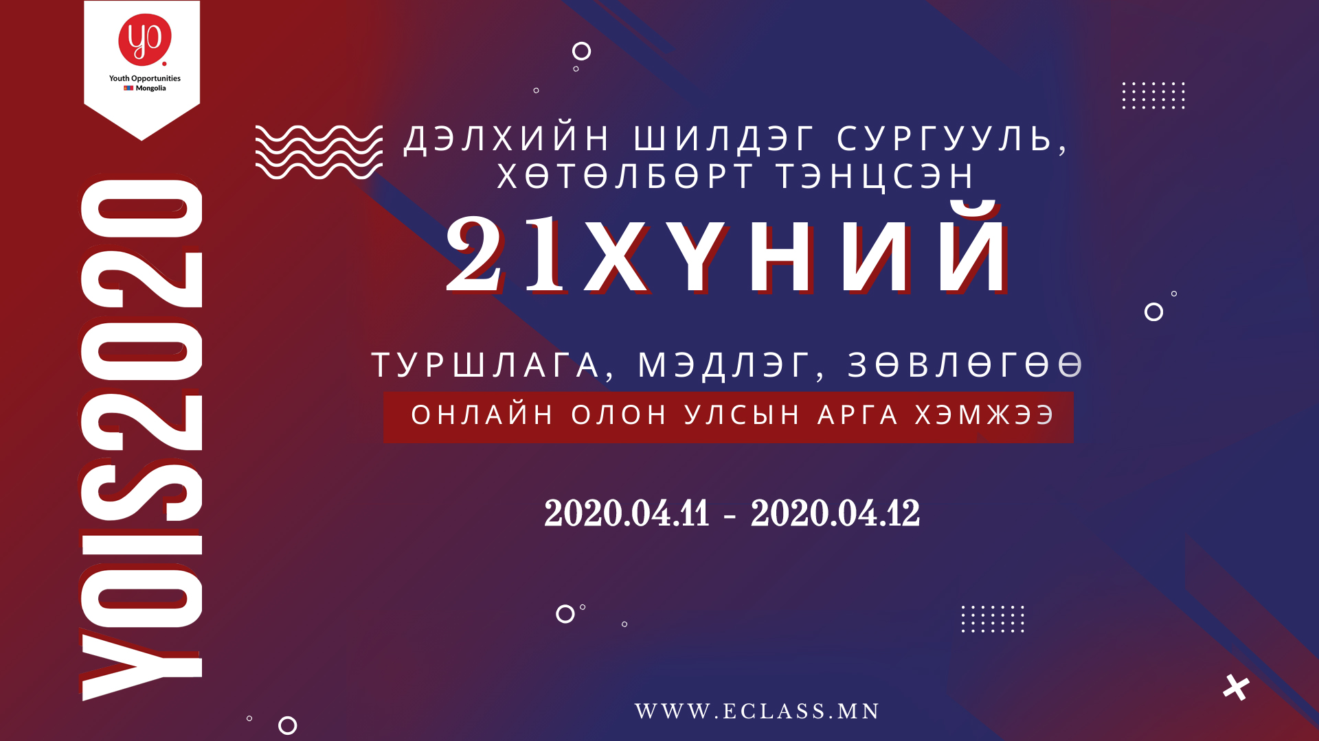 "YOIS 2020" олон улсын арга хэмжээ Монгол улсад хоёр дахь жилдээ зохион байгуулагдах гэж байна. Үүнтэй холбогдуулан өөрийгөө хөгжүүлэхийг хүсч буй 13-35 насны залуус та бүхэнд уг арга хэмжээнд уригдан оролцох гэж буй дэлхийн шилдэг их, дээд сургууль болон хөтөлбөрүүдэд хамрагдсан залуусын туршлага, зөвлөгөөг хүргэж байна.