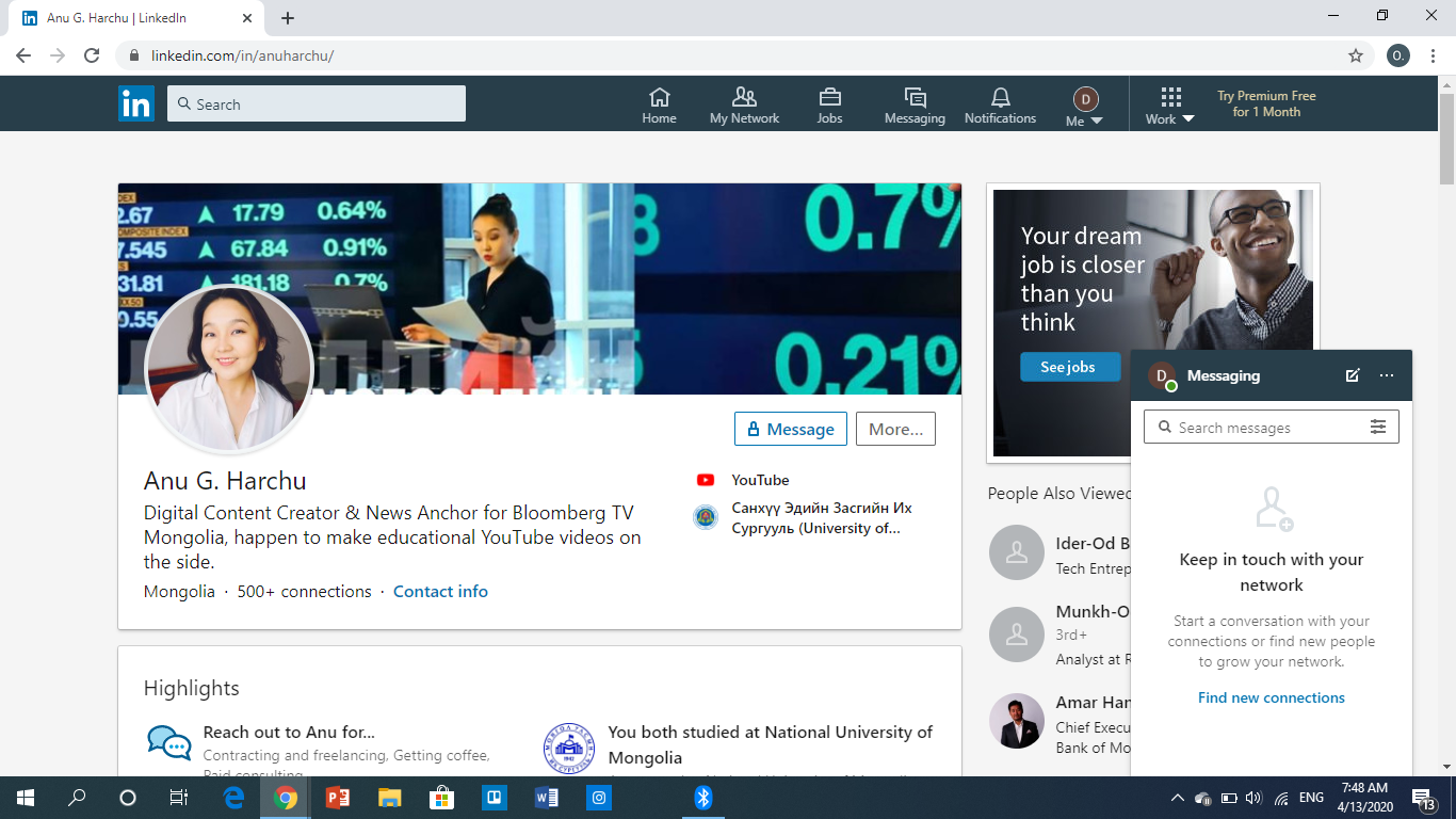 Анх LinkedIn-д хаяг нээгээд, нээсэн хаягаа хөгжүүлэх явцад цоо шинэ орон зайд ороод ирсэн юм шиг л мэдрэмж төрж билээ. Та бүхэн ч мөн анх удаа энэхүү платформыг ашиглаж үзэж байгаа бол "Bloomberg TV Mongolia" сувгийн нэвтрүүлэгч Ану эгчийн хаягийг дагахыг зөвлөж байна.