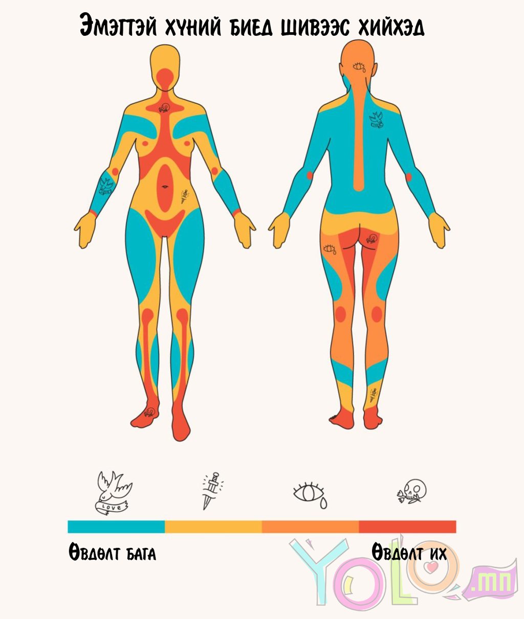 Ингээд шивээсний өвдөлтийн зэргийг эрэгтэй болон эмэгтэй хүний биеийн бүтэц дээр харуулбал: