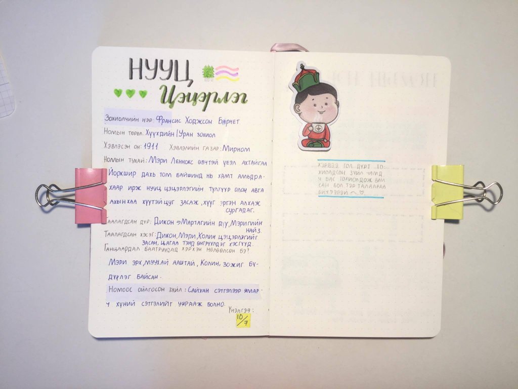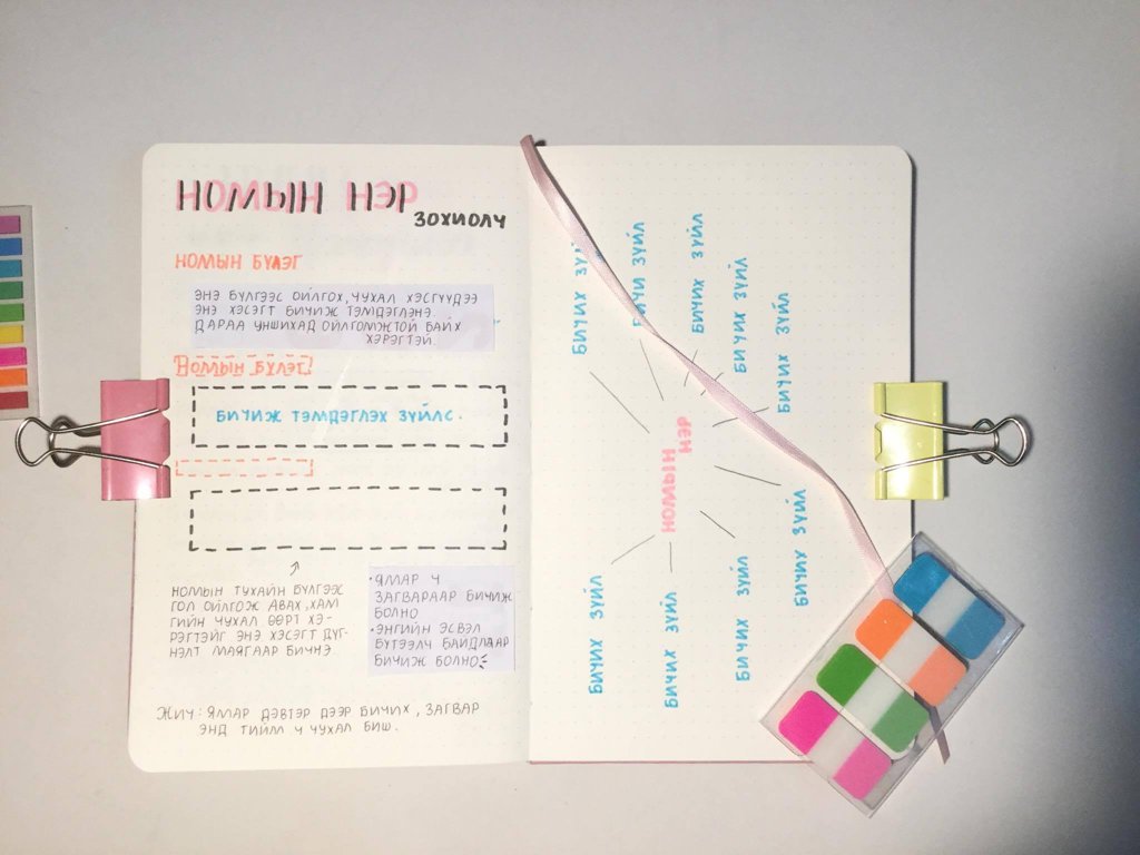 Номын тэмдэглэл хийхдээ бужо дэвтэр хөтөлдөг шиг чимэглэл хийвэл илүү сонирхолтой байх болно гэж амлая. Та олон өнгөөр бичсэн, энд тэндээ саа чимэглэл, наадаг зурагтай тэмдэглэл хийх дуртай төрлийн хүн бол өнгөлөг байдлаар, минималист хэв маягт дуртай бол цөөн хэдэн өнгөөр, цэвэрхэн байдлаар тэмдэглэлээ чимэглэх боломжтой.