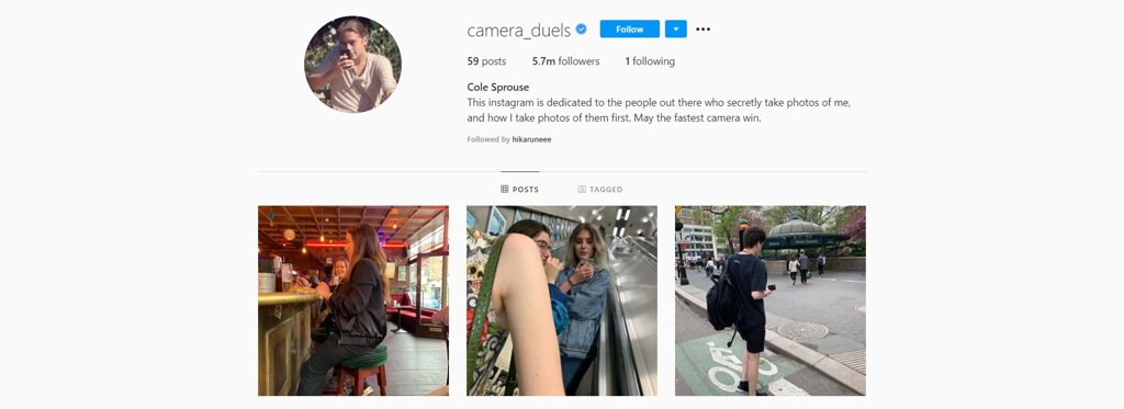 Кино урлагт тийм ч их ач холбогдол өгдөггүй хэсэг бүлэг хүмүүсийн хувьд Cole "Camera Duel" гэх хаягаараа алдартай. Тэрээр өөрийн албан ёсны Инстаграм хаягаасаа /@colesprouse/ гадна өөрийнх нь зургийг нууцаар авах гэж буй хүмүүсийн зургийг урт, хөгжилтэй тайлбарын хамт нийтэлдэг өөр нэгэн хаягтай /@camera_duels/. Энэ нь эхэндээ түүний хувийн орон зайгаа хамгаалах оролдлого байсан ч эцэстээ хүмүүс харин ч энэхүү хаягт нь өөрийнхөө зургийг багтаахын тулд илт мэдэгдэхүйц байдлаар зургийг нь авах гэж оролддог болжээ. Тийм ч учраас тэр энэ хаягаа тийм ч идэвхтэй ашиглахаа больсон биз ээ.