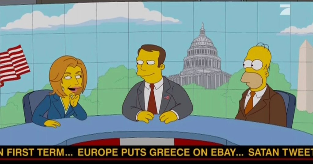 "Politically Inept, with Homer Simpson" гэх ангид гарч буй мэдээний доор "Европ Грек улсыг Ebay сайтаар зарна" гэсэн бичиг урсаж буйг харуулдаг. Энэ анги гарснаас хойш 4 жилийн дараа буюу 2017 онд ХБНГУ-ын Чөлөөт Ардчилсан Намын дарга Грек улсыг өрийн байдал дээр нь үндэслэн Европын Холбооноос гарах тухай бодож эхлэх хэрэгтэй гэж мэдэгджээ.