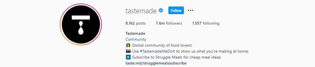 Тайлбар: Tastemade нь хоол болон аялал жуулчлалын нэвтрүүлгийн суваг юм. Инстаграм хуудсанд нь зөвхөн хоолны жор бүхий бичлэгүүд байх бөгөөд тайлбар хэсэгт орц болон заавар нь бичээстэй байдаг. Мөн гал тогооны өрөөн дэх ажлуудаа хөнгөвчлөх, ур чадвараа сайжруулахад тань туслах бяцхан хэрнээ маш үр дүнтэй аргуудыг ч хүргэдэг.