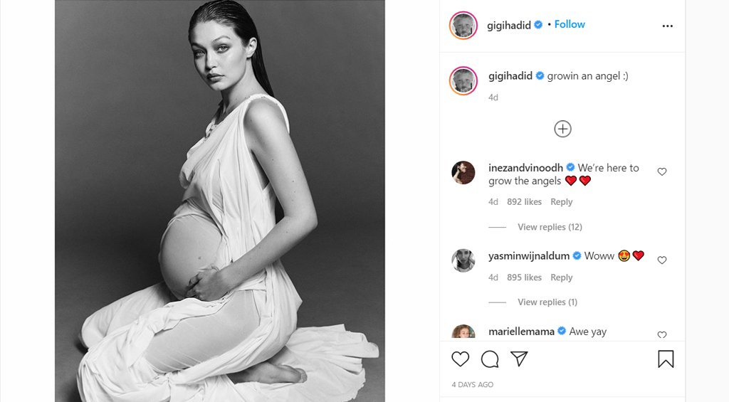 Дээрх зураг нь Gigi-гийн бие давхар байгаагаа олонд ил болгосон хамгийн анхны зураг бөгөөд "Сахиусан тэнгэр өсгөж байна" гэх тайлбартайгаар нийтэлжээ.