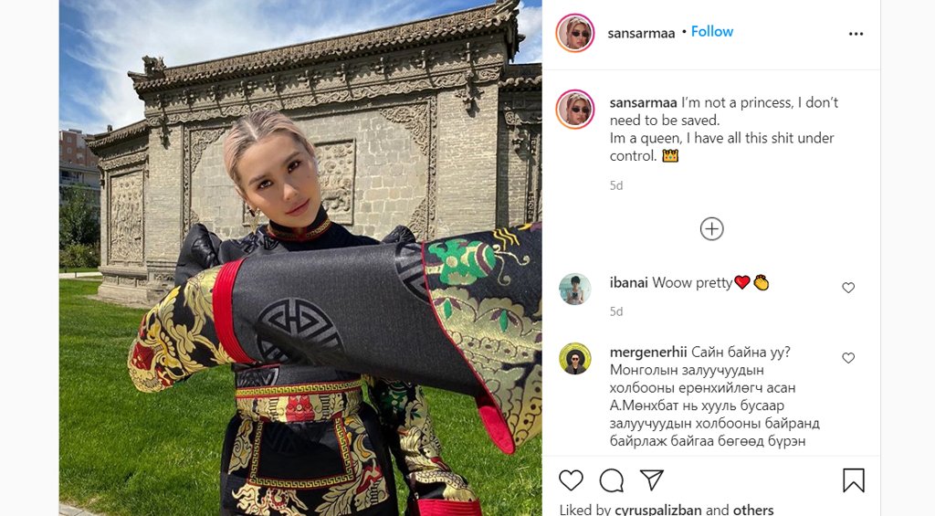 Өөрийн гэсэн зорилготой, хүчирхэг эмэгтэйгээс илүү үзэсгэлэн гоо гэж үгүй. Тэгвэл загвар өмсөгч, жүжигчин Сансармаа үүний нэгэн тод жишээ болж монгол дээлээрээ гоёсон зургаа хуваалцжээ. Тэрээр зургаа үндэсний гоёмсог хувцаснаас гадна ахин нэг “гоёл”-оор чимсэн нь зургийнх нь тайлбар байв.