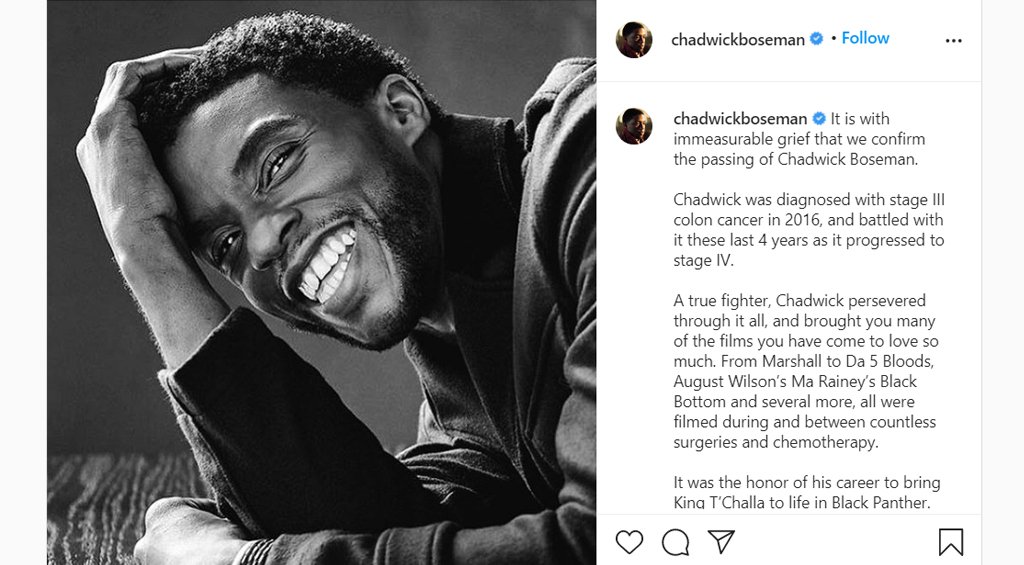 Chadwick 2016 оноос хойш хорт хавдартайгаа тэмцэж байсан хэдий ч үүнийгээ чандлан нууцалж, уг тэмцлийнхээ дундуур “Captain America: Civil War” (2016), “Black Panther” (2017), “Avengers: Infinity War” (2018), “Avengers: Endgame” (2019) зэрэг кинонуудыг үзэгчдэд маш чадварлагаар хүргэсэн.