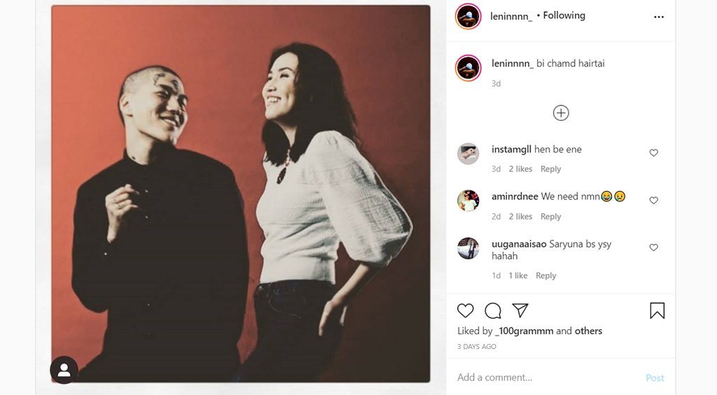 Одоогоос яг нэг жил орчмын өмнө “Миний Муужгай” дуугаар олны анхаарлыг татсан уран бүтээлч 168-ыг та бүхэн сайн мэдэх биз ээ. Цоо шинэ хэв маяг, этгээд гэмээр өнгө төрхөөрөө алдартай тэрээр өнгөрсөн долоо хоногт Инстаграм хуудсандаа нэгэн эмэгтэйн хамт авахуулсан зургаа нийтлээд “Би чамд хайртай” хэмээн гарчигласан байсан юм. Шүтэн бишрэгчид нь зураг дээрх эмэгтэйг түүний найз охин хэмээн таамаглаад байгаа билээ.