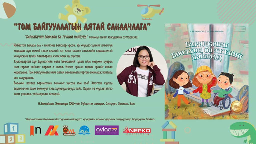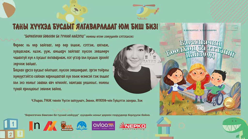Бид ярилцлагын энэ удаагийн буландаа “Монголын Тэргэнцэртэй Иргэдийн Үндэсний Холбоо”-ны төслийн зөвлөх, хүүхдийн номын зохиолч Б.Энхжаргалыг урьсан юм. Тэрээр “Бөөлхөний зүүдний найзууд”, “Барилгачин бөөлхөн ба түүний найзууд”, “Алаг цэцэгсийн хүрээлэн” зэрэг зохиолуудын эзэн. Энхжаргал өөрийн зохиол бүтээлүүдээрээ хөгжлийн бэрхшээл болон жендэрийн эрх тэгш байдлын тухай ойлголтыг нийгэмд эерэгээр түгээх зорилготой.