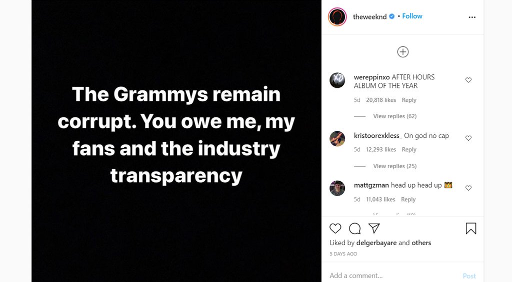 Харамсалтай нь дуучин The Weeknd тус наадмын ямар ч төрөлд нэр дэвшээгүй нь олон хүний урмыг хугалсан хэрэг болоод байгаа юм. Үүний талаар зөвхөн шүтэн бишрэгчид нь төдийгүй дуучин The Weeknd өөрөө ч сошиал медиадаа нийтлээд амжжээ.