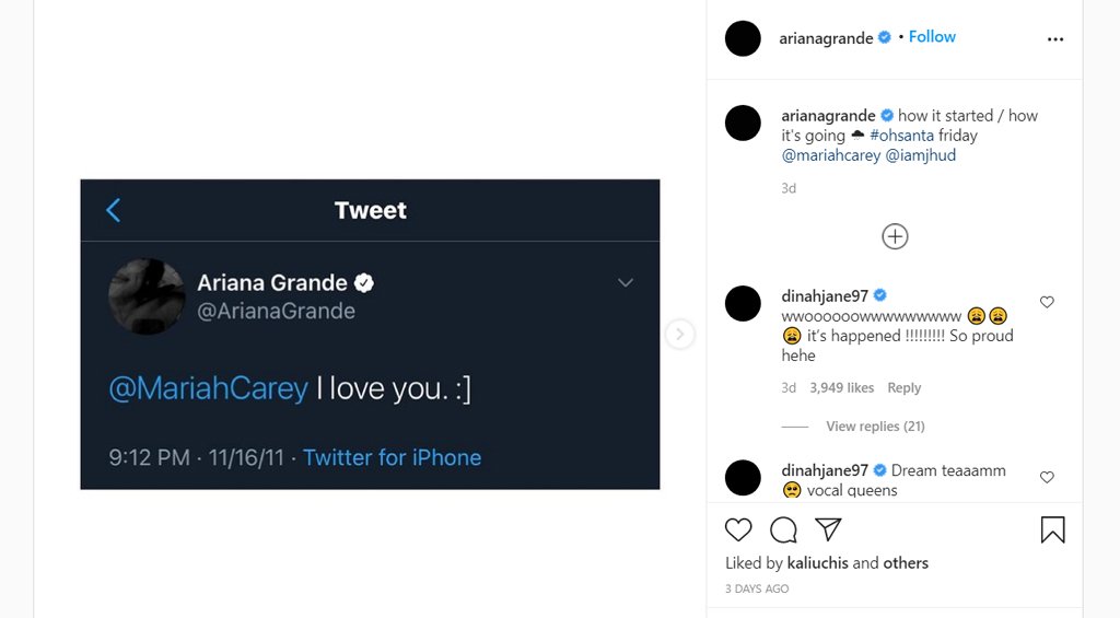 Та бүхэнд сонирхуулан хэлэхэд дуучин Ariana Grande тэртээ 2011 онд Твиттер хуудаснаа шүтэн бишрэгчийн хувиар “Хайртай шүү, Mariah Carey” хэмээн бичиж байсан бол энэ жил хамтран уран бүтээл гаргаж буй тухайгаа бахдал дүүрэн хуваалцжээ.