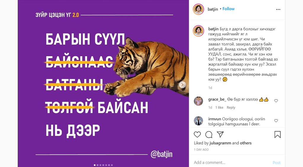 “Барын сүүл, батганы толгой аль нь ч байж болно. Бүгд л дарга болохыг хичээдэг гажууд нийгмийг яг л илэрхийлсэн юм шиг. Чи заавал толгой, захирал, дарга байх албагүй. Ахиад хэлье, өөрийгөө уудал, сонс, ажигла. Чи хэн яг юм бэ? Тэр батганых нь толгой байгаад аз жаргалтай байхаар хүн юм уу? Эсвэл барын сүүл гэдгээ хүлээн зөвшөөрөөд өөрийнхөөрөө амьдрах юм уу?”