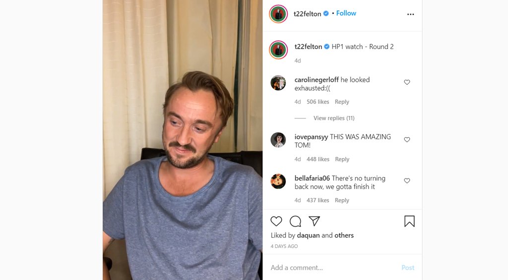 Харин уг бүтээлийн кино хувилбарт Draco Malfoy-ийн дүрийг бүтээсэн жүжигчин Tom Felton Инстаграм хуудаснаа нэгэн сонирхолтой цувралыг эхлүүлжээ. Тэрээр 20 жилийн дараа “Harry Potter” цувралын кинонуудыг үзэж буй бөгөөд өөрийн мэдрэмжүүдээ бичлэг хэлбэрээр хуваалцаж байгаа аж.