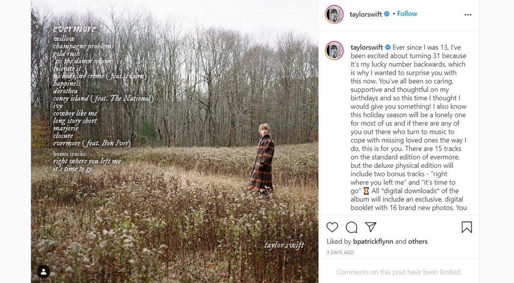 - “Миний азын тоо хойноосоо 31 учраас би 13 настайгаасаа хойш л 31 нас хүрэх тэр өдрийг их догдлон хүлээдэг байсан. Тиймээс би та бүхэнд үүгээр гэнэтийн бэлэг барихыг хүссэн юм. Та бүхэн миний төрсөн өдөр болгоноор дэмжлэг үзүүлж, халамжилдаг байсан учраас энэ удаад би та бүхэнд ямар нэг зүйл өгье гэж бодсон юм. Бас энэ баярын өдрүүд ихэнх хүний хувьд их ганцаардмал өнгөрөх байх. Хэрэв та ч бас над шиг хайртай хүмүүсээ санасан үедээ хөгжмөөр өөрийгөө аргацаадаг бол үүнийг танд зориулж байна...” хэмээн бичжээ.