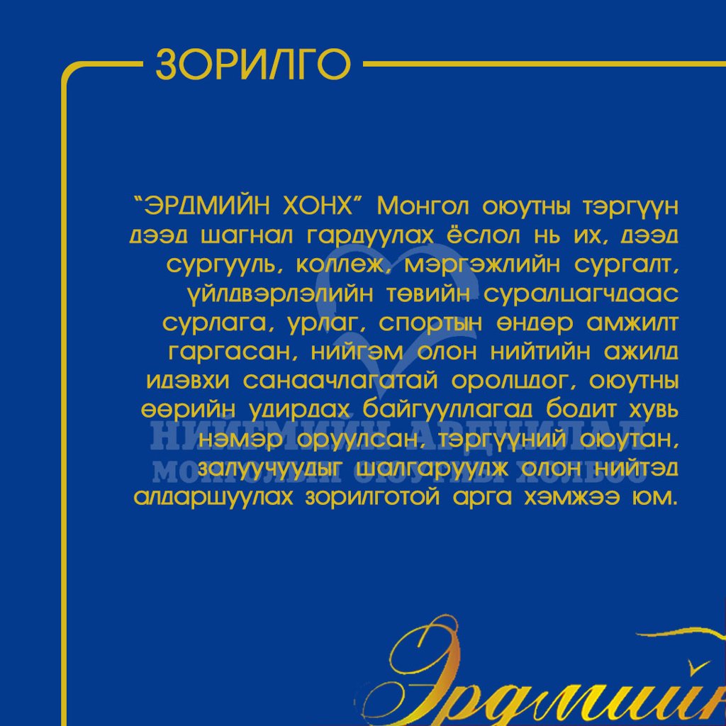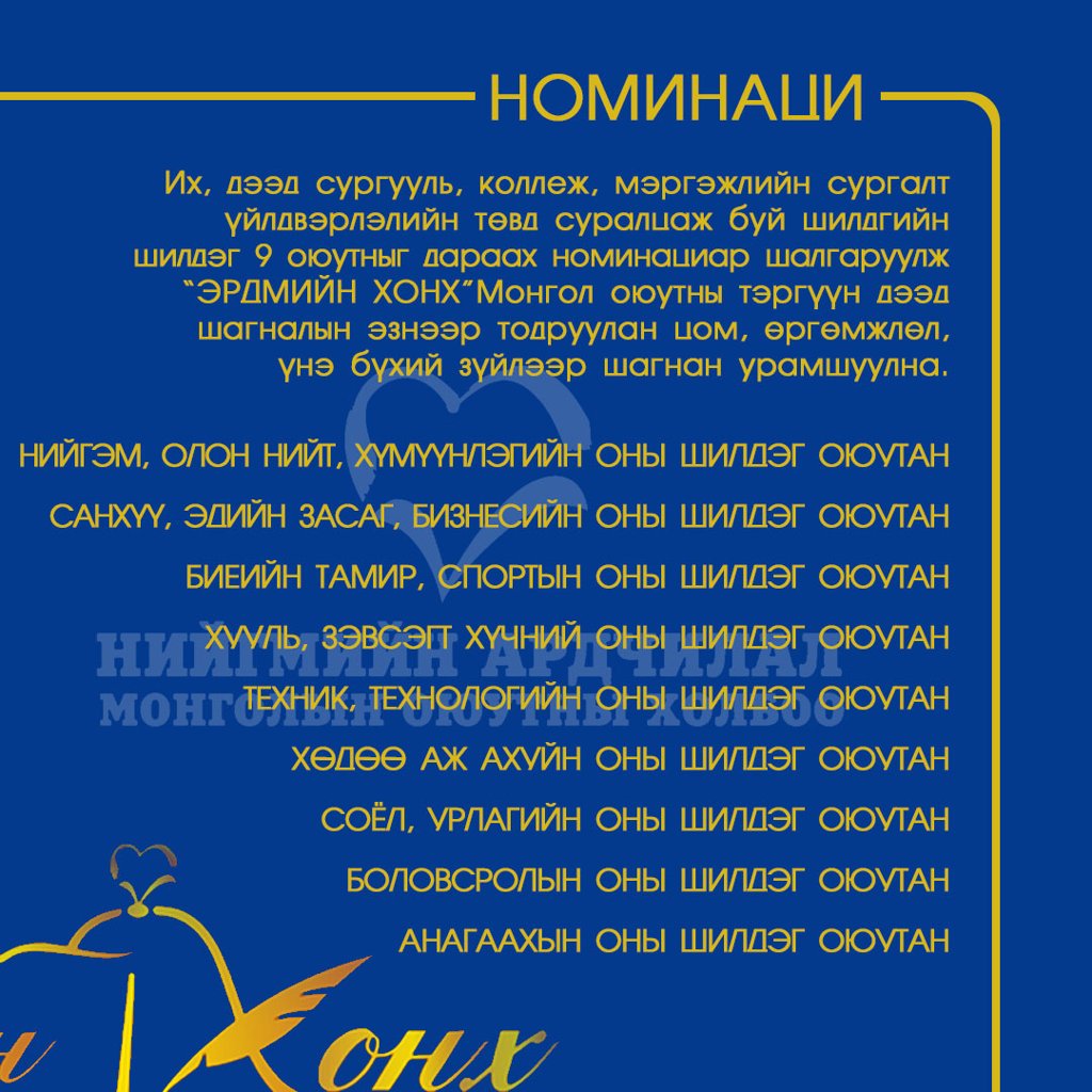 "Эрдмийн хонх" Монгол оюутны тэргүүн дээд шагнал гардуулах ёслол 10 дахь жилдээ зохион байгуулагдах гэж байна. Энэ нь их, дээд сургууль, коллеж, мэргэжлийн сургалт, үйлдвэрлэлийн төвийн суралцагчдаас сурлага, урлаг, спортын өндөр амжилт гаргасан, нийгэм олон нийтийн ажилд идэвх санаачлагатай оролцдог, оюутны өөрийн удирдах байгууллагад бодит хувь нэмэр оруулсан, тэргүүний оюутан, залуучуудыг шалгаруулан шагнаж урамшуулдаг арга хэмжээ юм.