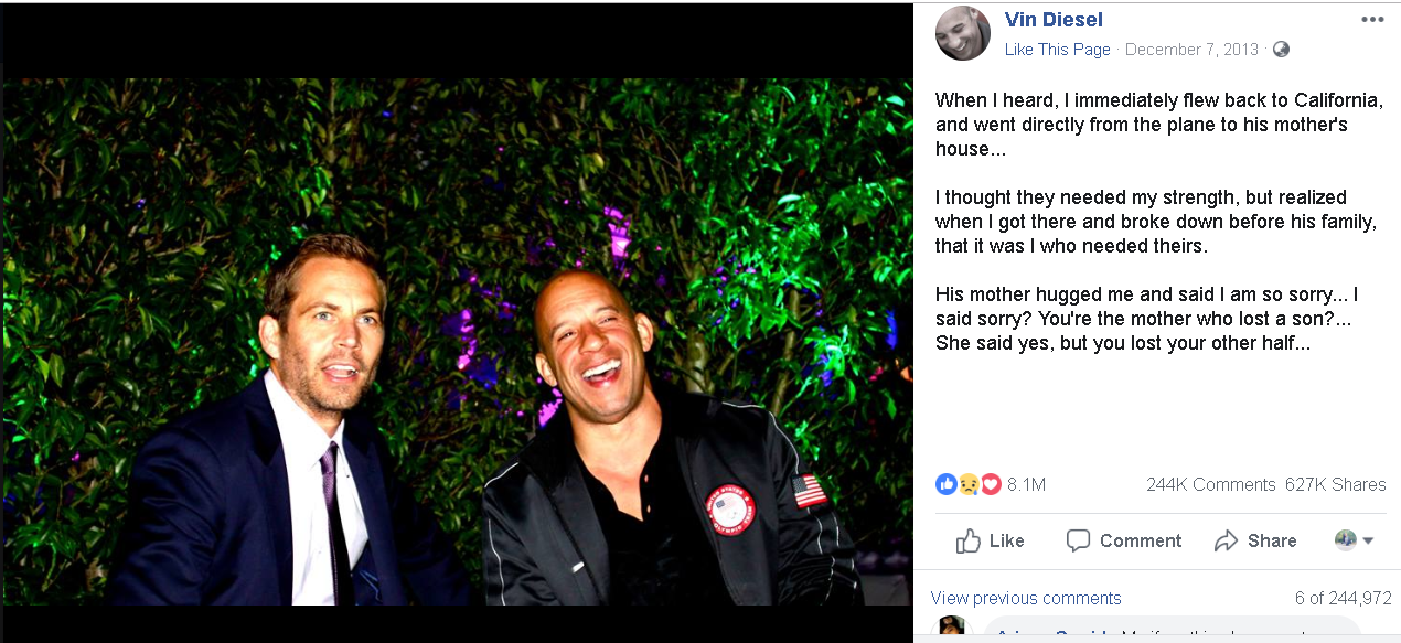 Жүжигчин Vin Diesel-ийн найз Paul Walker-ийгаа дурсан санасан нийтлэл нь Фэйсбүүк сүлжээнд дэх хамгийн олон like-тай нийтлэл /post/ болсон байдаг. Өөрөөр хэлбэл 2013 оны арванхоёрдугаар сард талийгаач Paul Walker-тай авахуулсан зургаа дараах тайлбарын хамт нийтэлсэн нийтлэл нь 7,9 сая like хүлээн авжээ.