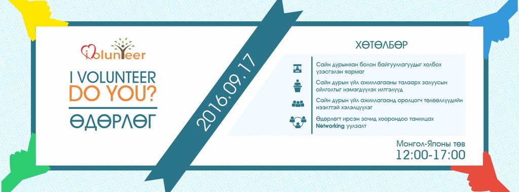 Ivolunteer санаачилгаас зохион байгуулж буй “I Volunteer, Do you?" нээлттэй өдөрлөг нь сайн дурынхан болон төрийн бус байгууллагыг холбох, залуусын сайн дурын үйл ажиллагааны талаарх ойлголтыг нэмэгдүүлэх, сайн дурын үйл ажиллагааны талаар арвин туршлагатай зочдын зөвлөгөө, сэтгэгдлийг хуваалцах зорилготойгоор зохион байгуулагдах гэж байна. Өдөрлөг энэ Бямба гарагт буюу есдүгээр сарын 17-ны 12-18 цагийн хооронд Монгол-Япон төвд болох юм.