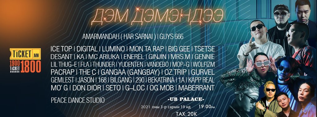 Тайлбар: Монголын хип хоп уран бүтээлчид нэгдэн хандивын тоглолт зохион байгуулахаар болжээ. Энэхүү наадамд та бидний хайртай Big Gee, Desant, Vandebo, Tsetse тэргүүтэй уран бүтээлчид хүрэлцэн ирэх юм.
