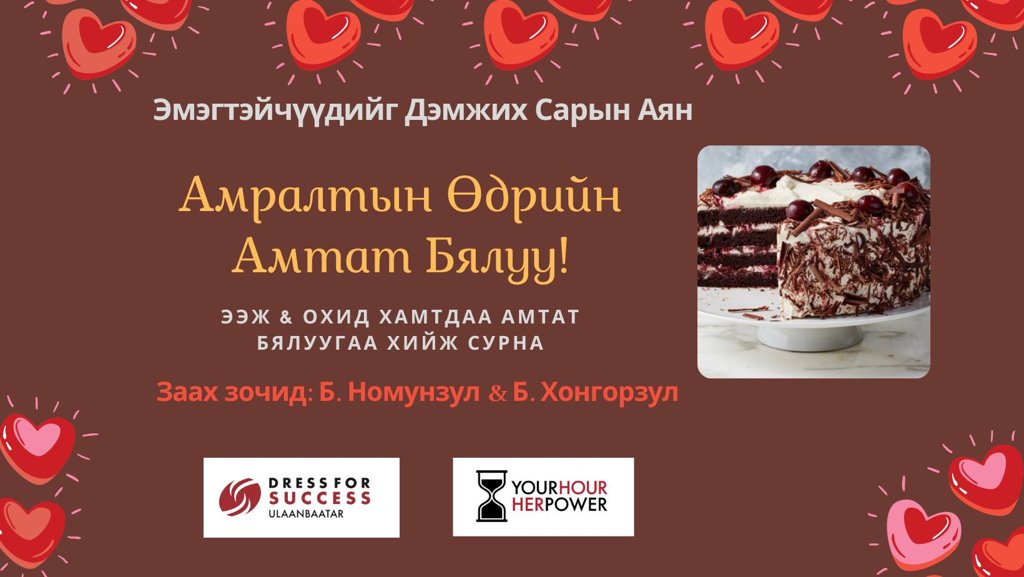 Тайлбар: “Dress for Success Ulaanbaatar”-ийн зүгээс бүсгүйчүүддээ зориулан гэрийн нөхцөлд амтат бялууг хэрхэн хийх талаар онлайн сургалт орох аж. Та энэхүү сургалтад хамрагдсанаар Black Forest хэмээх амтат шоколадтай бялууг хийж сурах болно. Энэхүү бялуу нь Европын орнуудад алдартай, хүмүүсийн амтархан иддэг бялууны нэг юм.