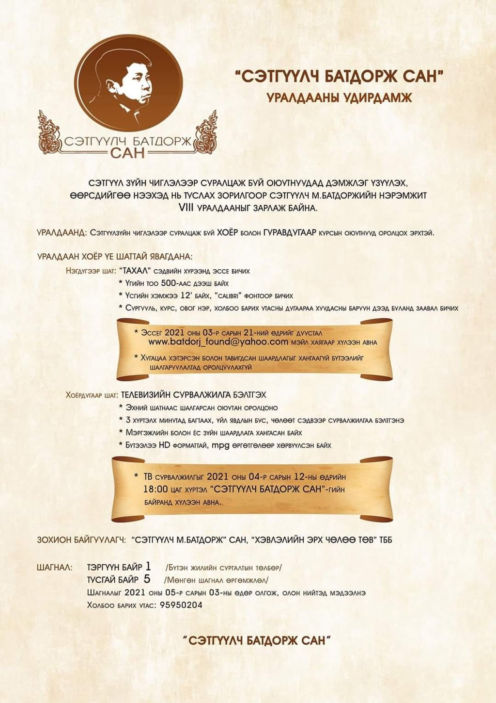 Тайлбар: "Сэтгүүлч М.Батдорж” сангаас сэтгүүлзүйн ангийн оюутнуудад зориулсан тэтгэлэгт уралдааныг найм дахь жилдээ зарлажээ. Уралдаанд сэтгүүлзүйн чиглэлээр суралцаж буй хоёр, гуравдугаар дамжааны оюутнууд оролцох боломжтой.