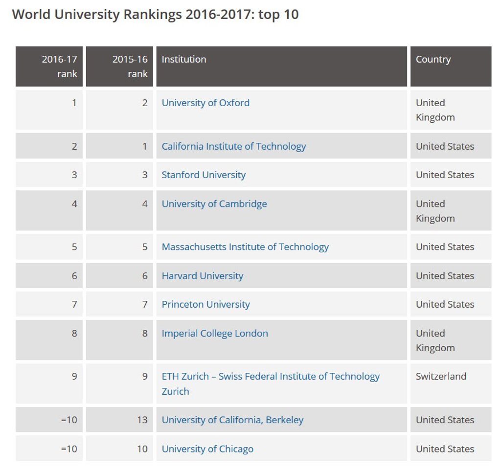 Жагсаалтыг Их Британийн Оксфордын их сургууль илэрлээ. Тус сургууль энэхүү жагсаалтыг анх удаа тэргүүлж буй юм. Харин удаах байрт АНУ-ын Калифорнийн Технологийн их сургууль, Стэнфордын их сургууль тус тус оржээ.