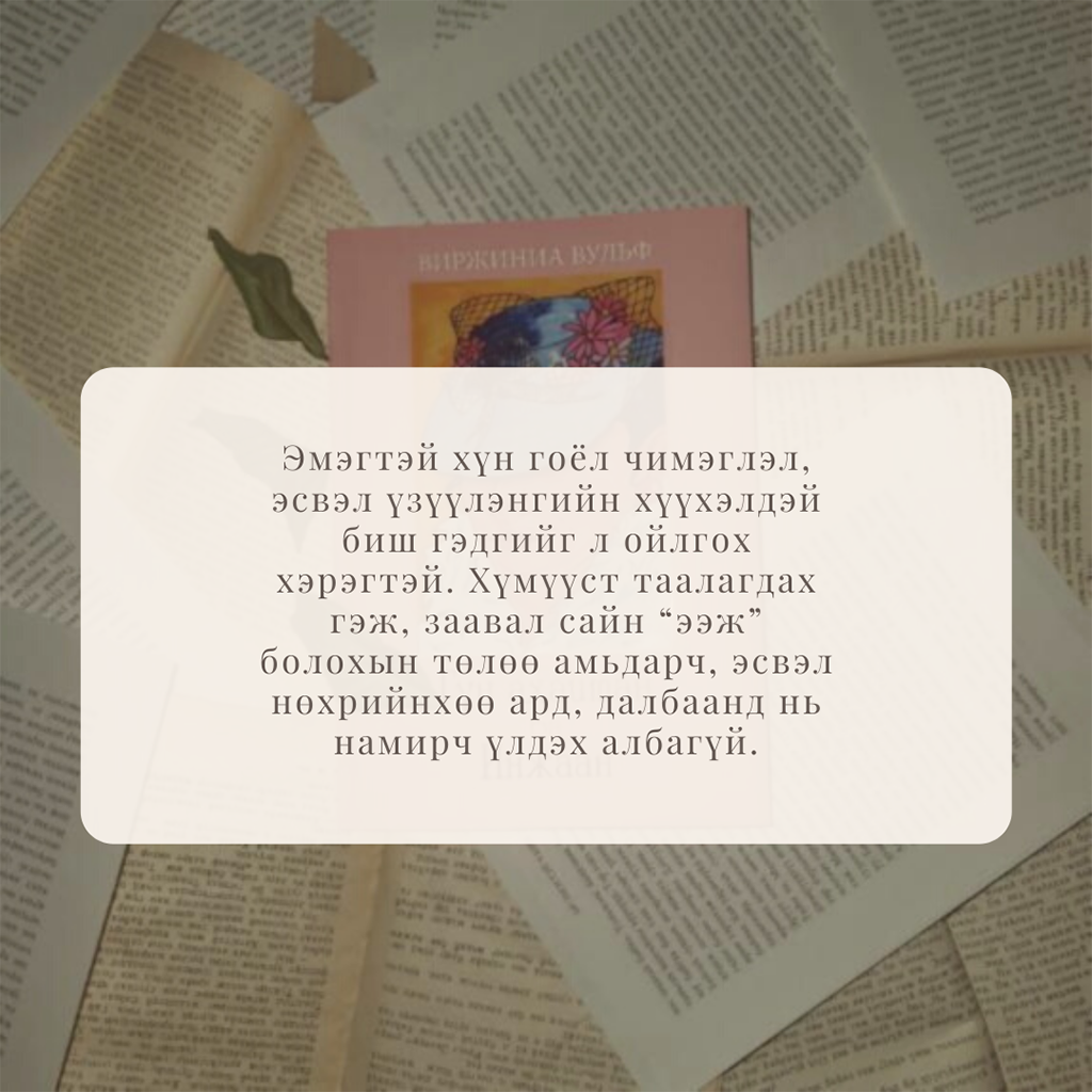 - Вульфийн намтар түүх их сонирхолтой. Гэхдээ анх үзэл санаанд нь илүү татагдаж зохиолуудад нь дурласан. 1900-аад он буюу эмэгтэйчүүд ажил хийх нь бүү хэл гэрээсээ ч гардаггүй байсан үед тэрээр феминист үзэлтэй, философич, зохиолч нэгэн байсан гэдэг нь гайхалтай. Тэгэхэд өнөө үед зарим монгол эмэгтэйчүүд өөрийнхөө эрхийг хамгаалахаас “татгалзаж, няцаагаад” байдаг нь харамсалтай.
