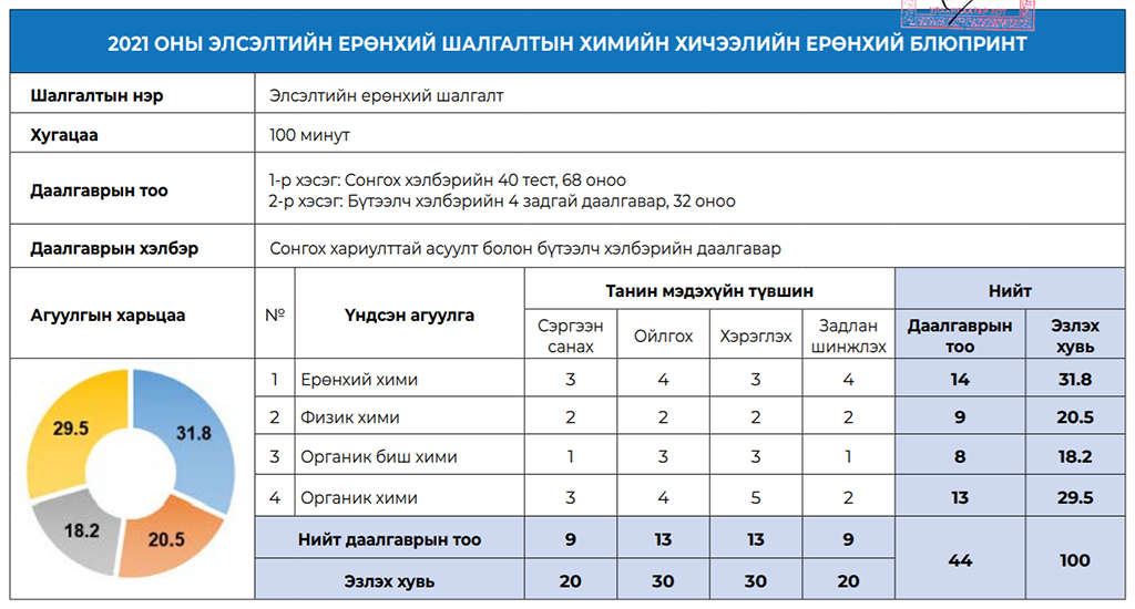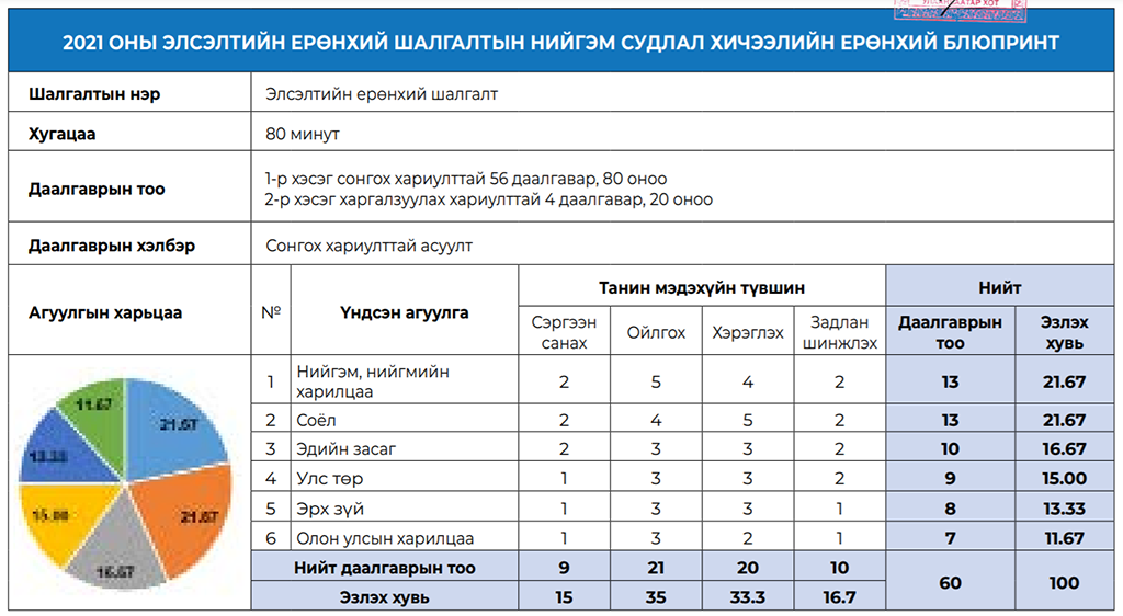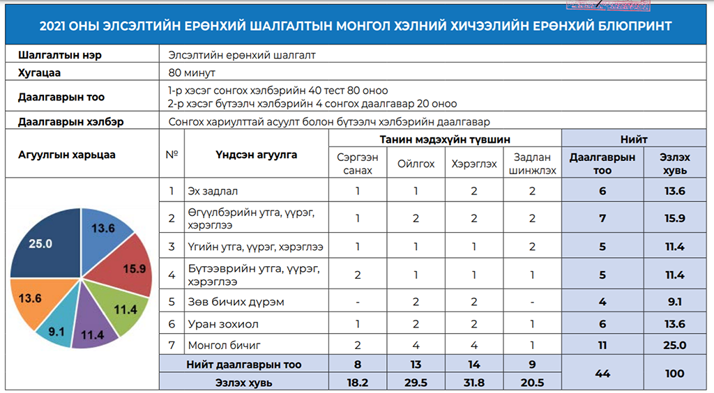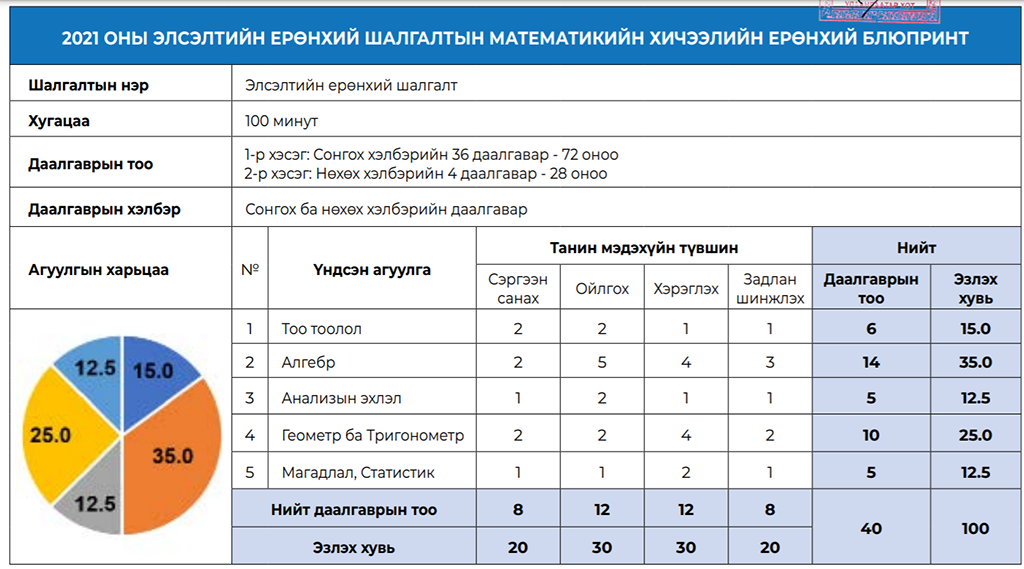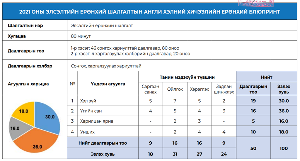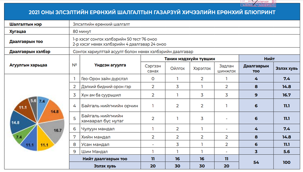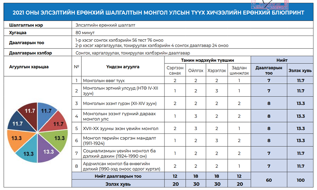 Энэ жил Элсэлтийн ерөнхий шалгалт өгөх залуус анхаараарай. 2021 оны ЭЕШ-ын сэдэв даалгаврын агуулгын хүрээ буюу ерөнхий блюпринт гарсан байна.