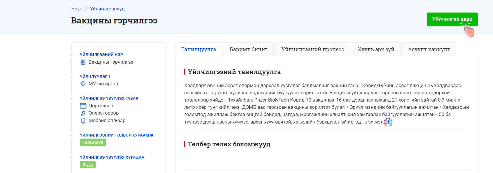 Вакцины хоёр тунгаа хийлгэсэн иргэдийн мэдээлэл e-mongolia.mn сайтад байршиж буй. Тиймд цаашид вакцины хоёр тунд хамрагдсан эсэхээ албан бичгээр баталгаажуулах шаардлага гарвал тус сайтад өөрийн мэдээллийг оруулан бүртгүүлж, Үйлчилгээнүүд – Вакцины гэрчилгээ – Үйлчилгээ авах хэсэгт хандан уг мэдээллийг монгол эсвэл англи хэл дээр хүлээн авах боломжтой. Энэ бүх процесс тавхан минутад л амжилттай болно.